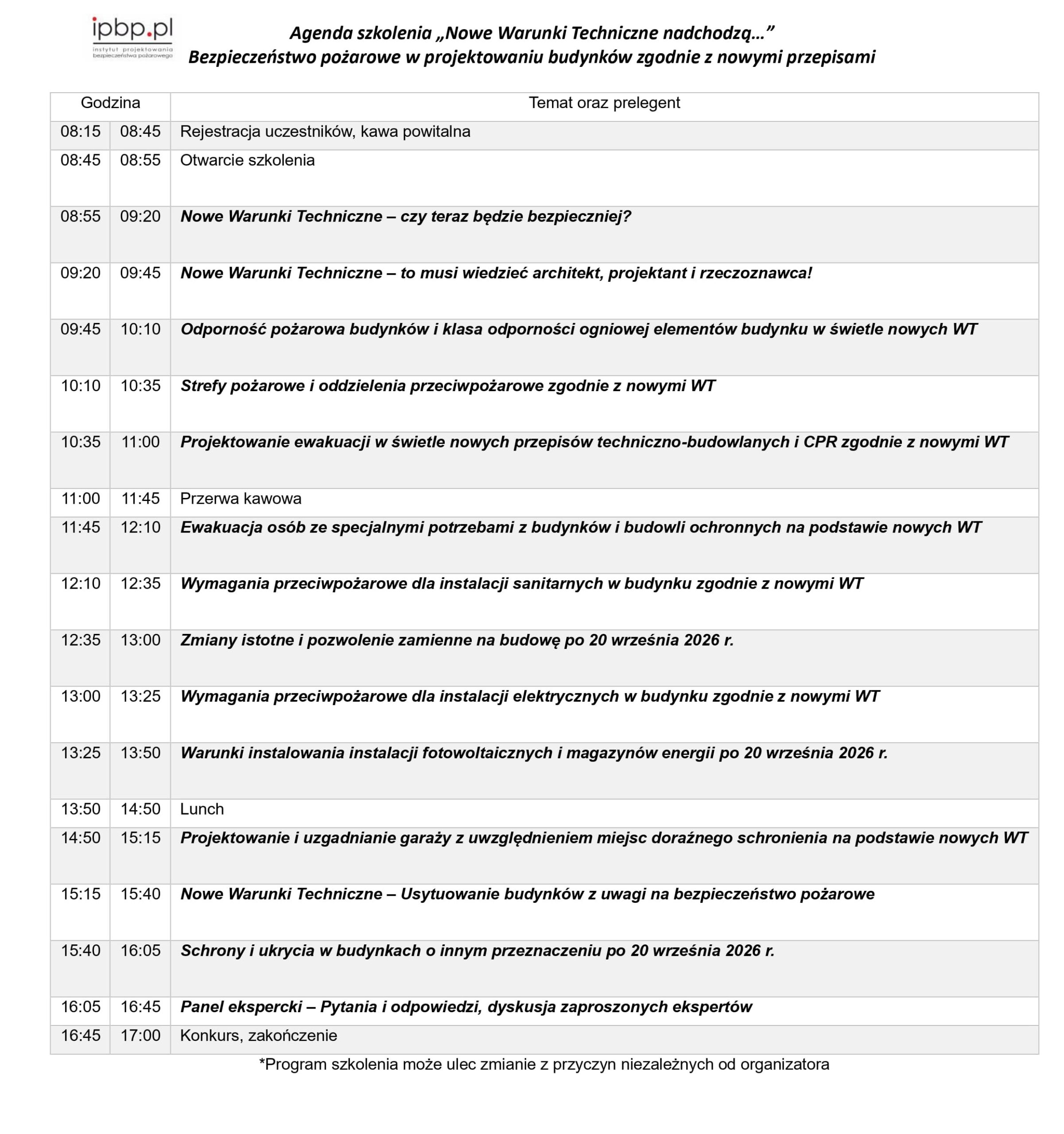 Podczas szkolenia zostaną przeprowadzone prelekcje przez ekspertów w dziedzinie ochrony przeciwpożarowej, dzięki którym uczestnicy będą mieli okazję zdobyć praktyczną wiedzę, jak również będzie możliwość udziału w panelu pytań i odpowiedzi z udziałem specjalistów i praktyków branży.